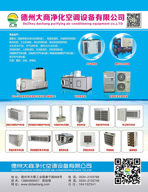 德州大商凈化空調(diào)設(shè)備有限公司是一家生產(chǎn)中央空調(diào)凈化空調(diào)設(shè)備及空氣凈化器的專業(yè)制造商。公司產(chǎn)品包括風(fēng)冷屋頂式凈化空調(diào)機組、恒溫恒濕(凈化)空調(diào)機組 、單元式空氣調(diào)節(jié)機組 、冷凍除濕機組 、泳池除濕機組、風(fēng)冷管道式空調(diào)機組、風(fēng)冷直膨式凈化空調(diào)機組、工業(yè)除濕機組、風(fēng)(水)冷柜機、 組合式空調(diào)機組、冷凝熱回收機組等一系列空調(diào)產(chǎn)品及中央空調(diào)末端配套使用的空氣凈化器,并可根據(jù)用戶需求設(shè)計制造各類非標(biāo)產(chǎn)品。產(chǎn)品型號齊全,性能穩(wěn)定可靠,外形美觀大方,使用方便舒適。