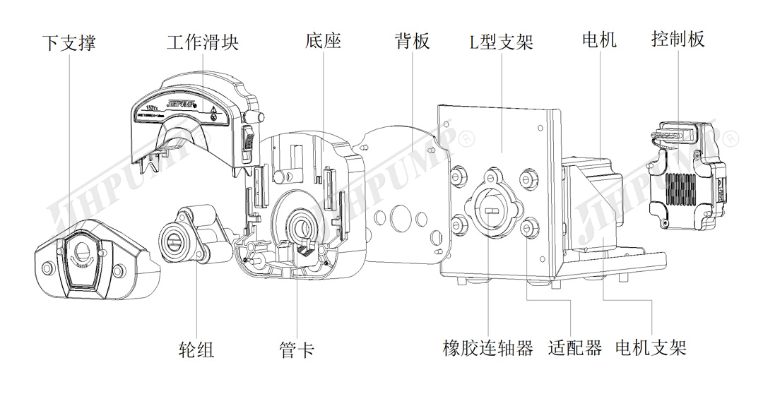 泵頭:聚苯硫醚(黑色)/聚醚砜(白色) 輪組:304 不銹鋼 L 型支架:304 不銹鋼 |